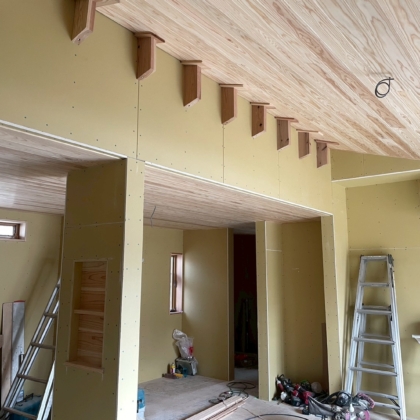 屋外の方は板貼りも終わり、そとん壁の下塗りまで完了し、後は仕上げの上塗りと軒天塗装を残すのみとなっております。外部足場の撤去ももう間もなくです。